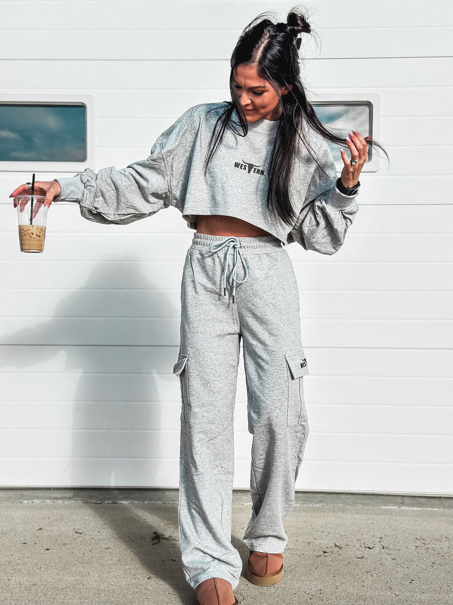 Cropped crewneck / cargo bottoms sold as a set