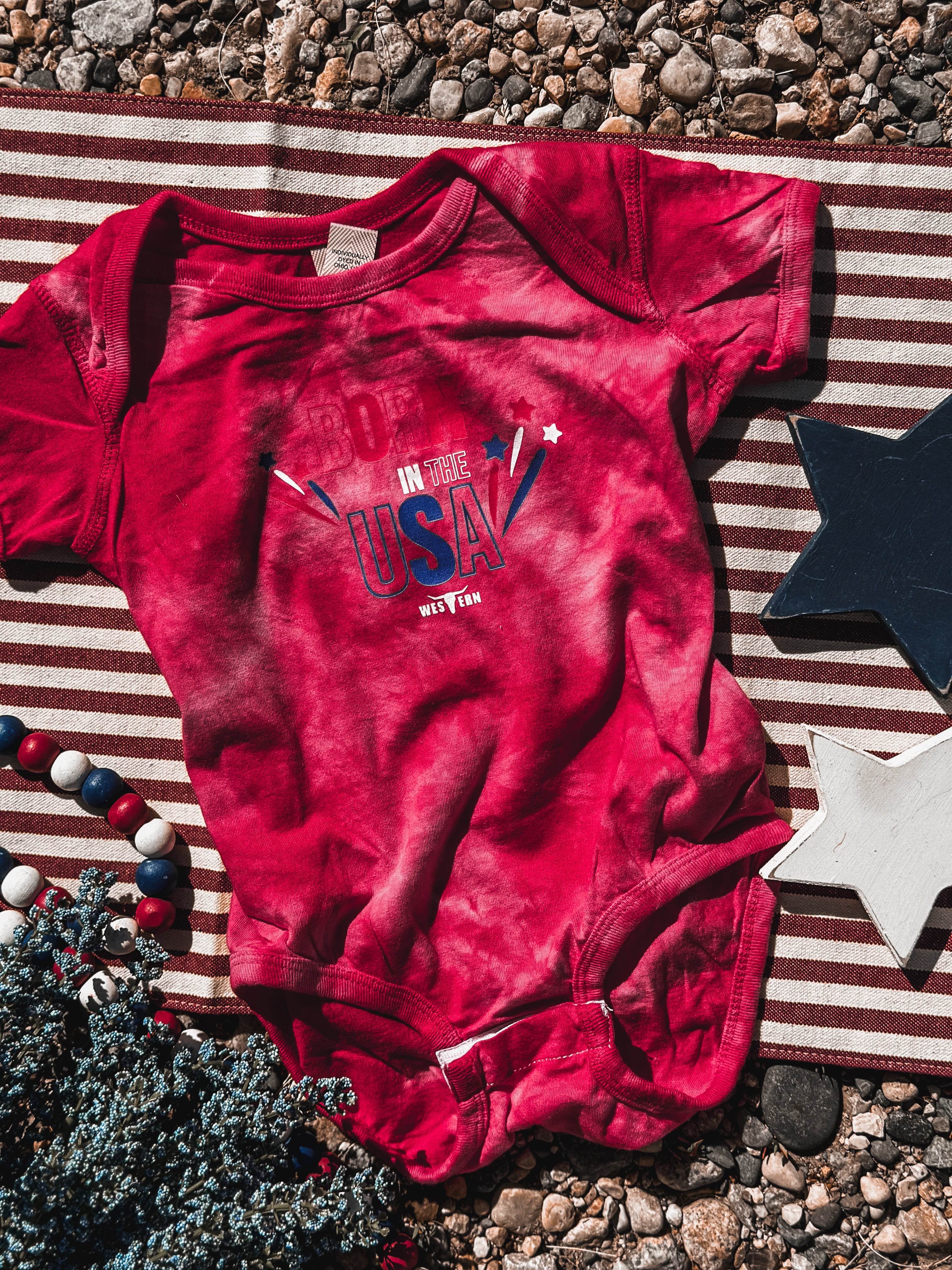 Born in the USA Onesie - Red Tie Dye Product form$15.00 Size Size chart Newborn 6M 12M 18M Free pickup in our shop(s) Quantity Add to cart