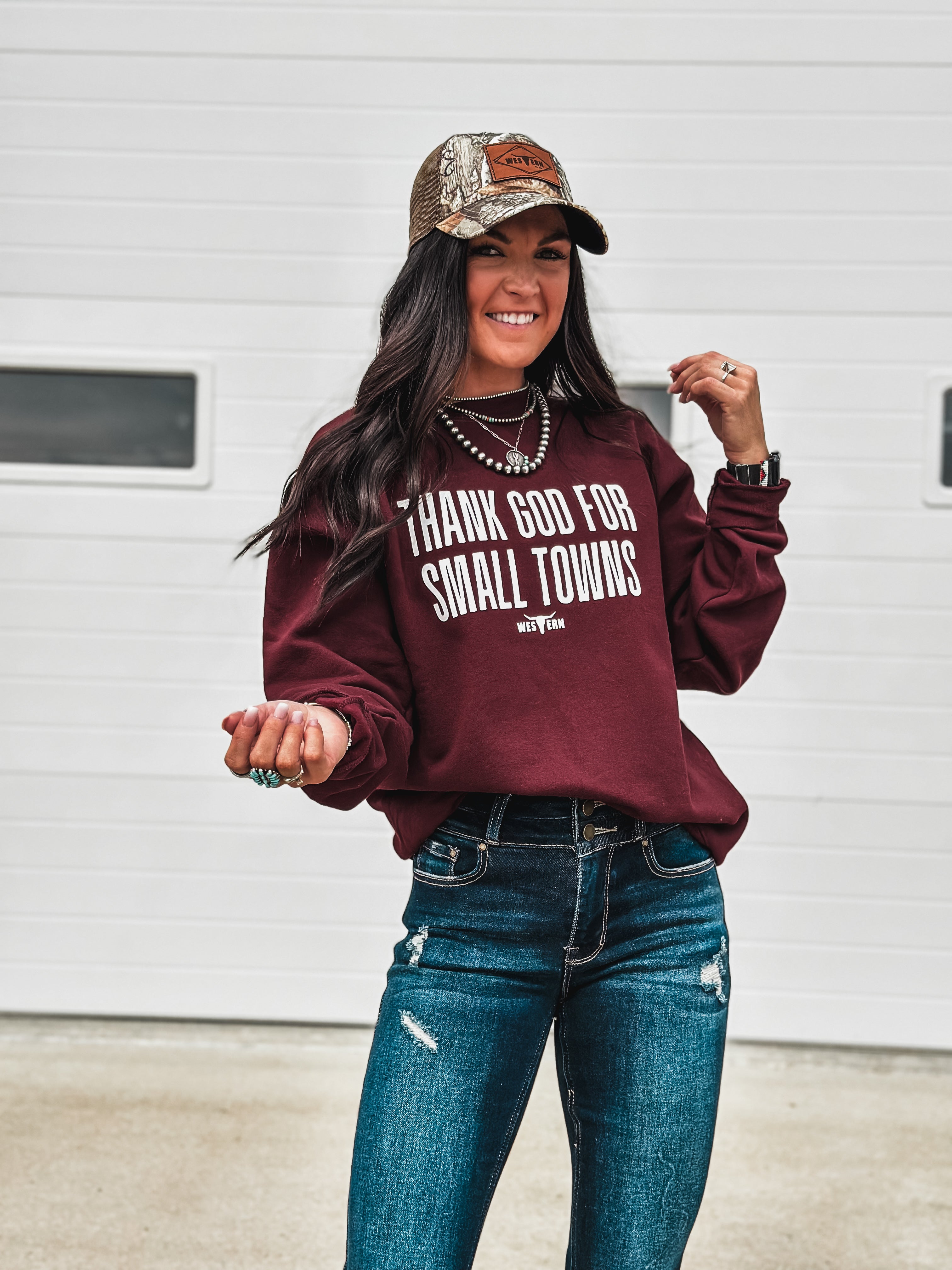 THANK GOD FOR SMALL TOWNS Crew - Maroon 1 review Product form$40.00 Size Size chart Small Medium Large XL 2XL Free pickup in our shop(s) Quantity Add to cart