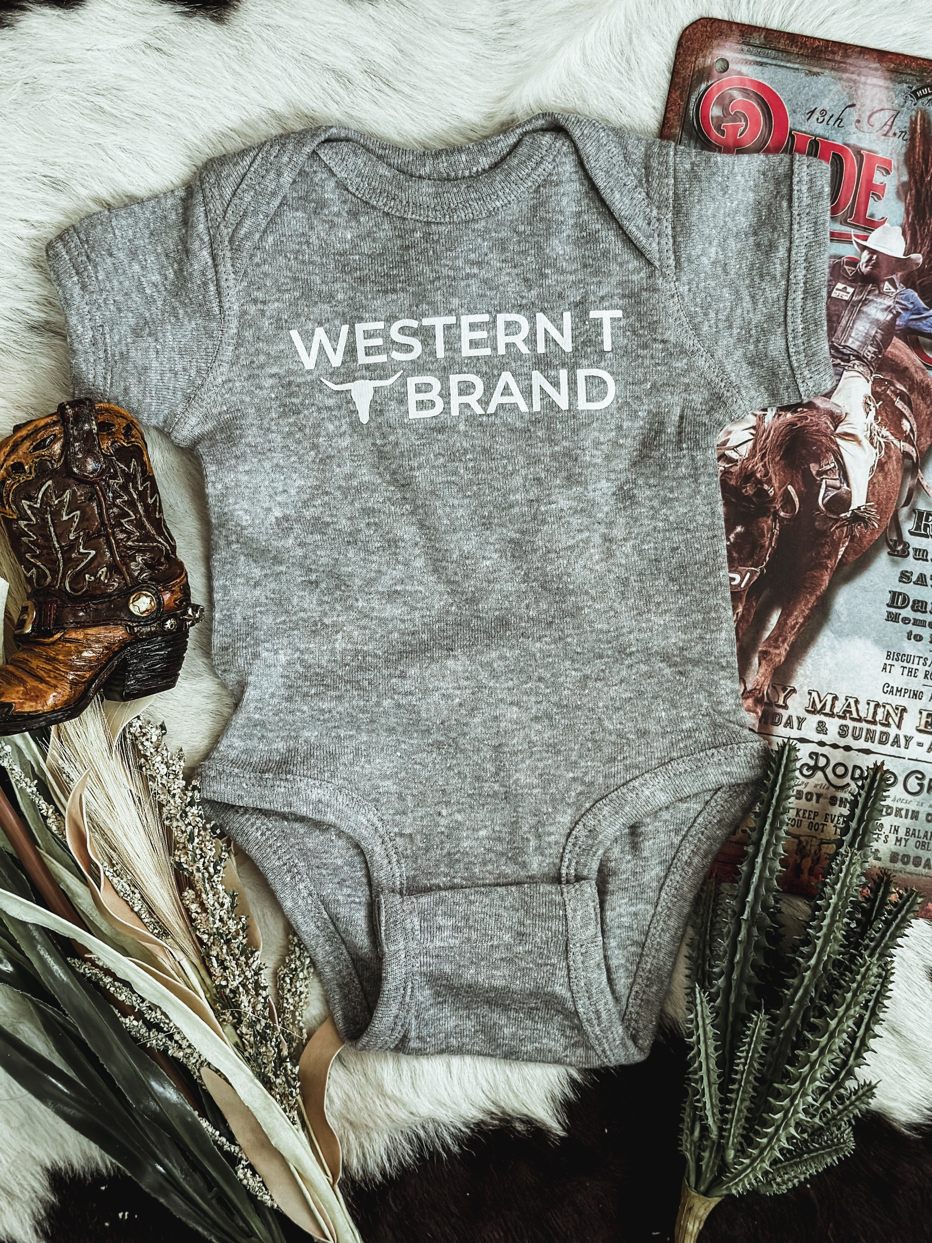 Western T Brand Onesie - Grey Product form$15.00 Size Size chart Newborn 6M 12M 18M Free pickup in our shop(s) Quantity Add to cart